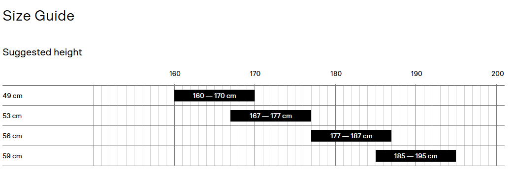 Our F/All-Road size range starts from 49cm to fit smaller riders down to 160cm tall and up to size 59cm for riders up to 195cm. The four size options are ideally suited to provide you with an optimal fit.