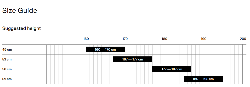 Our F/All-Road size range starts from 49cm to fit smaller riders down to 160cm tall and up to size 59cm for riders up to 195cm. The four size options are ideally suited to provide you with an optimal fit.