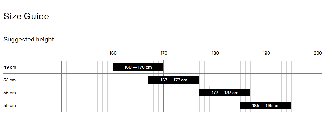 Our F/All-Road size range starts from 49cm to fit smaller riders down to 160cm tall and up to size 59cm for riders up to 195cm. The four size options are ideally suited to provide you with an optimal fit.