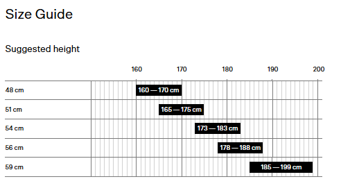 5 sizes from 48cm to 59cm fit nearly every rider.