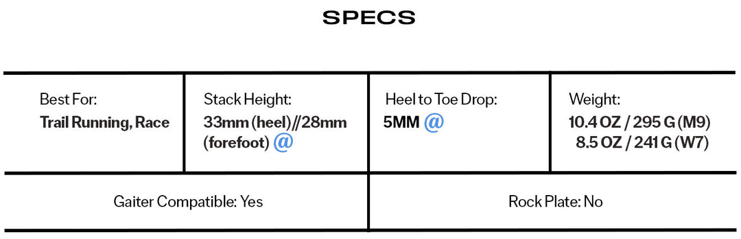 Our new upper is fine-tuned for performance on technical terrain. The MTN Racer 4 now features our FKT insole, allowing for faster water drainage and added rebound, while our improved gaiter attachment system keeps out debris.