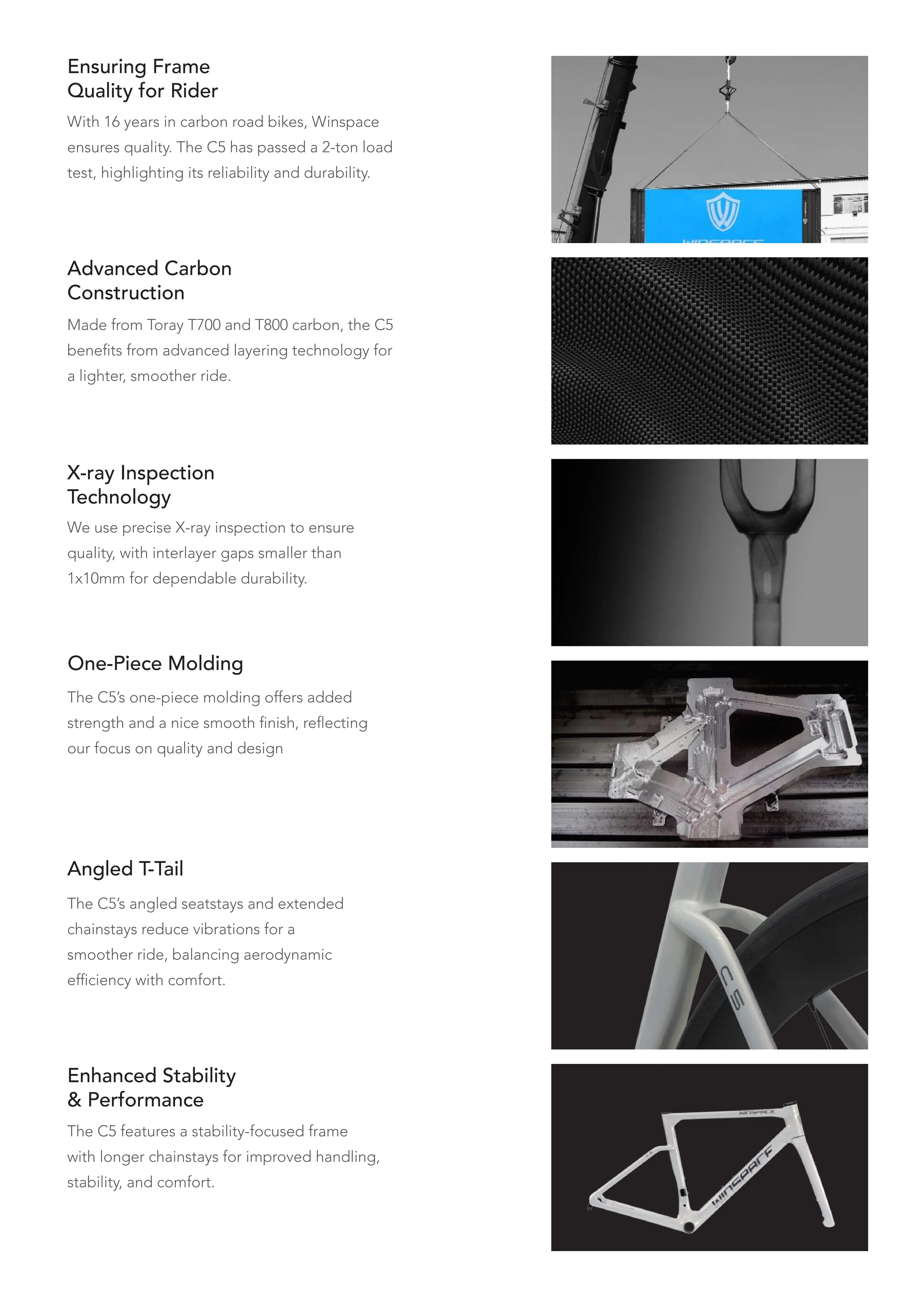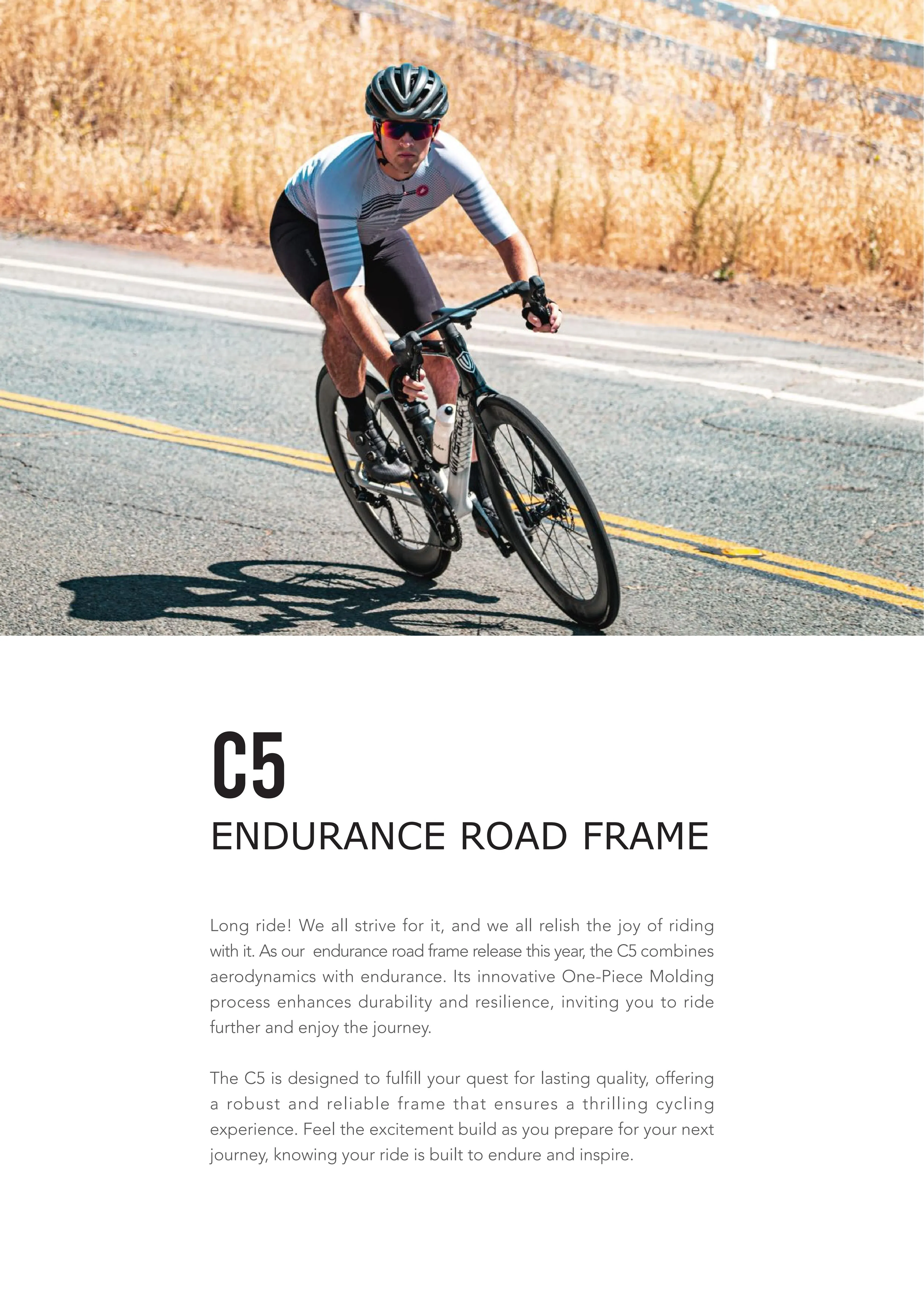 The C5 is the second all-round road frame launched this year, blending aerodynamic and endurance qualities. Its unique One-Piece Molding process makes it more durable and resilient, allowing you to enjoy the fun of riding and go further.